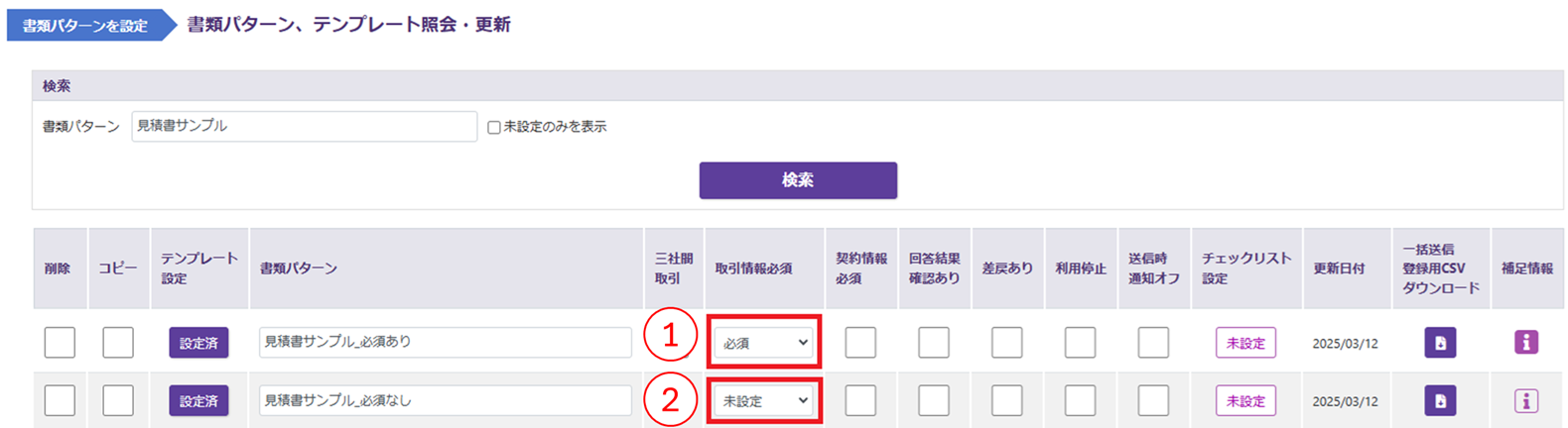 検索対象の取引は、①取引情報必須で取引年月日、または取引金額未入力の取引、②取引情報自体が入力の必要ない取引となります。 ※書類パターンでは下記に該当します。
